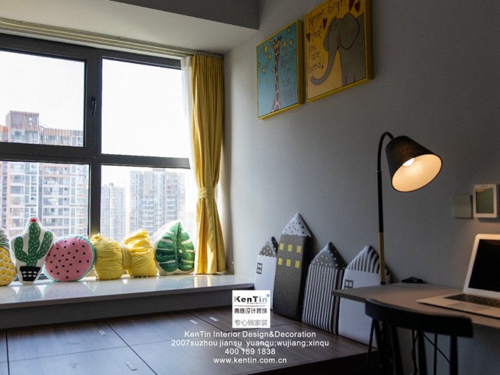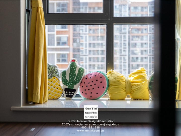書房的榻榻米可以變身儲(chǔ)藏柜,平時(shí)可以用來儲(chǔ)物,鋪上床品就能變成一個(gè)小臥室。床靠背卡通可愛,陽臺(tái)擺滿漂亮的抱枕,意趣十足,以后也可以作為兒童房使用。