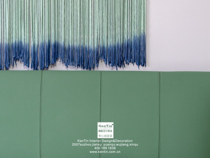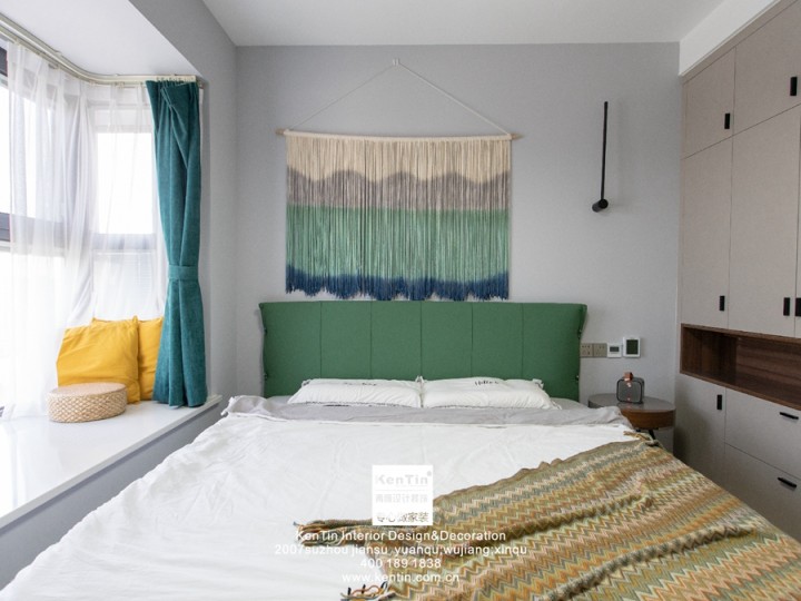 新家的臥室以溫馨舒適為主,床靠背柔軟,靠上去格外放松。不同房間的背景墻都做了精心的布置。富有特色的扎染工藝品情調(diào)非常,是自然又質(zhì)樸的畫作。
